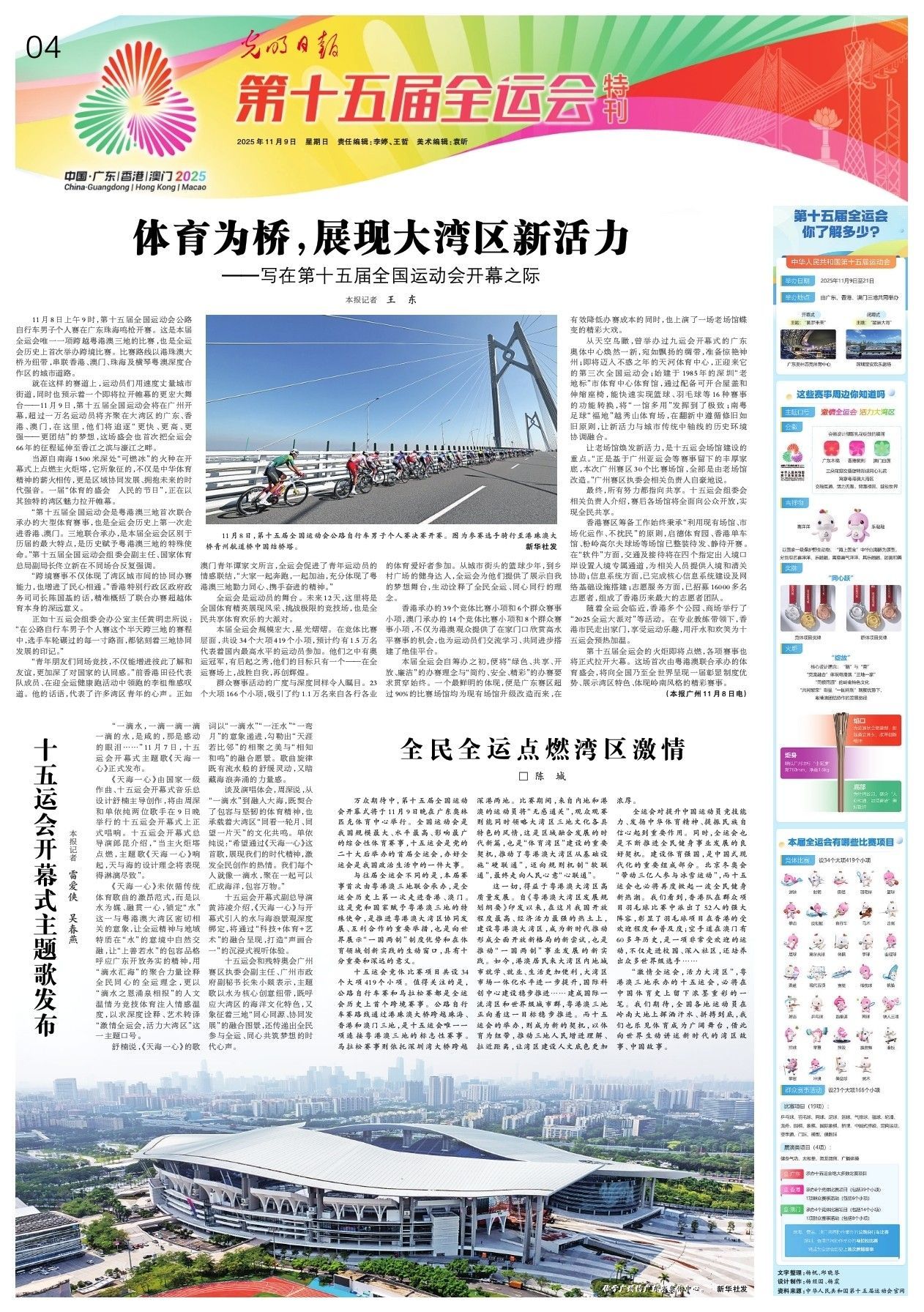 第十五届全运会体育比赛共设大项34个,小项419个。需要指出的是,公路自行车赛和马拉松赛都是全国赛事史上首次跨界赛事。该公路自行车路线经港珠澳大桥穿越珠海、香港和澳门。这是第十五届全运会唯一连接粤港澳的标志性赛事。本次马拉松赛将通过连接深圳和香港的深圳湾大桥。比赛过程中,来自内地、香港、澳门的运动员将无忧无虑地通过,让观看比赛的观众体验到各地独特的文化。同时在大湾区设立多个地点。这是区域一体化发展的时代新篇章,也是建设“体育湾区”的重要机遇。我们将推动粤港澳大湾区从基础设施“硬联系”转向规则制度“软联系”,最终走向人与人之间“心连心”。