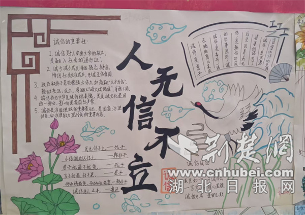 荆楚网(湖北日报)(通讯员 牛路 李阳)为培养学生诚信,引导学生在成长过程中坚守道德准则,襄阳市美孚中学八年级学生中文组近日举办了主题为“诚信与我同行”的手抄报写作活动。各班学生积极参与,用色彩和文字加深对“整体”的理解。